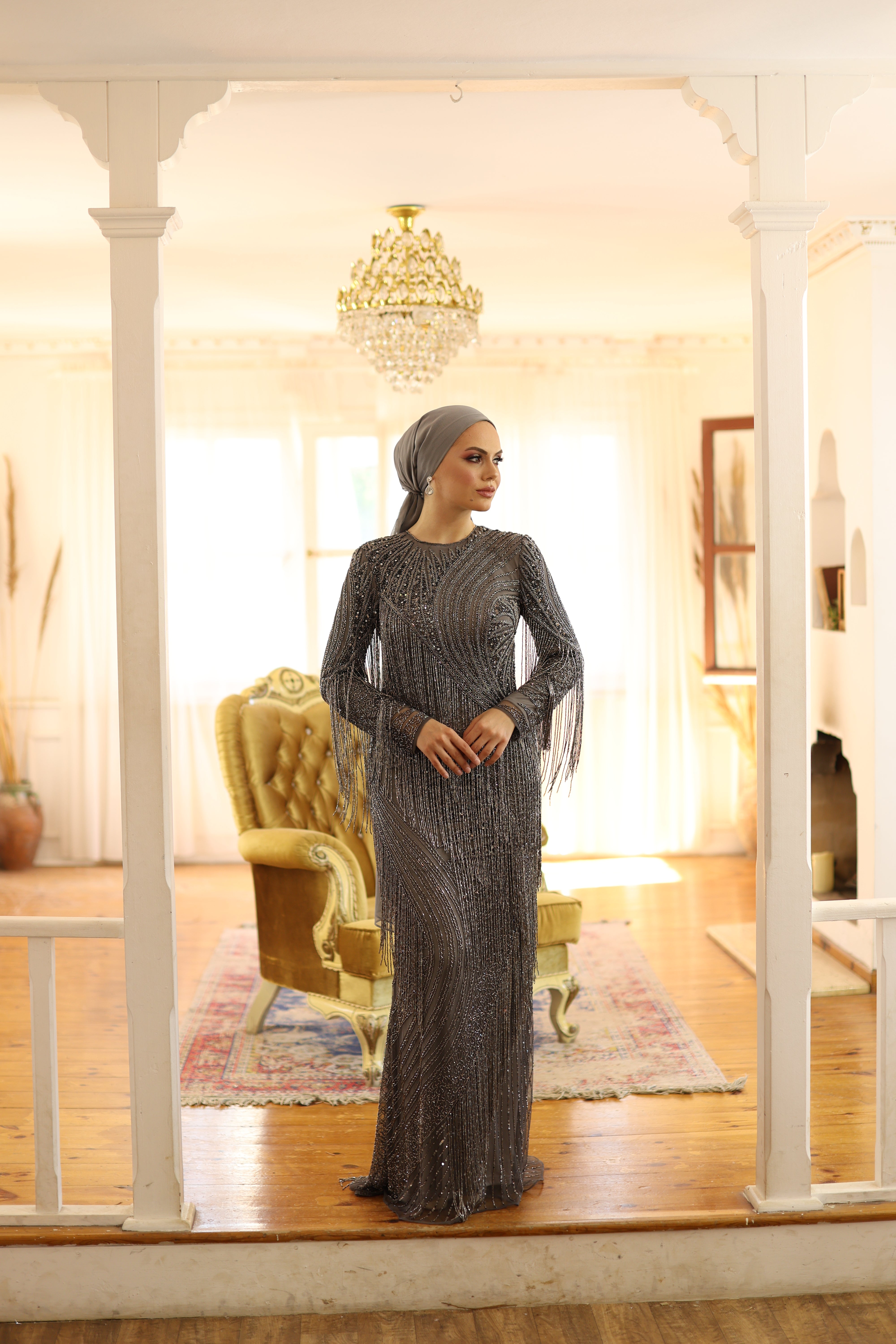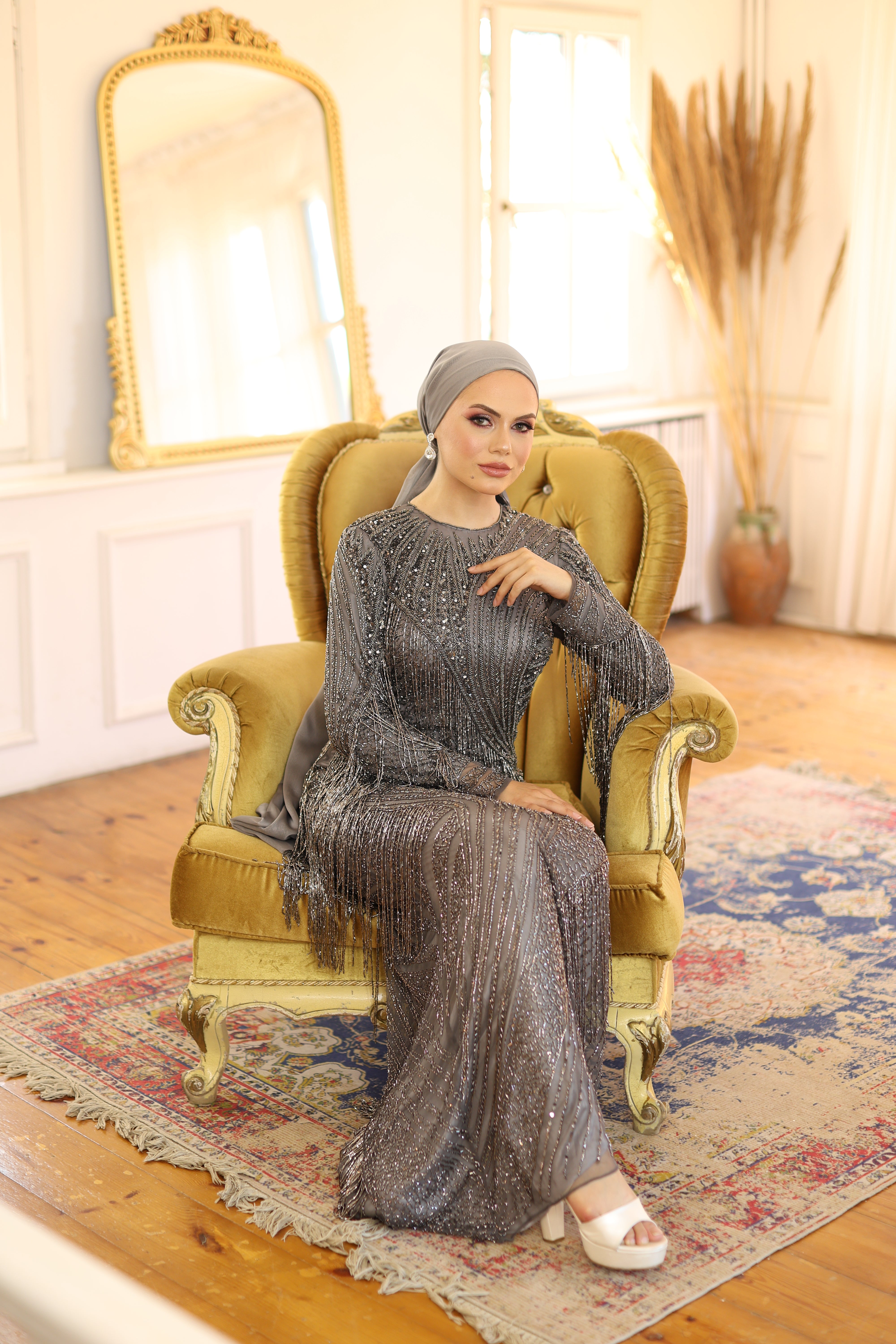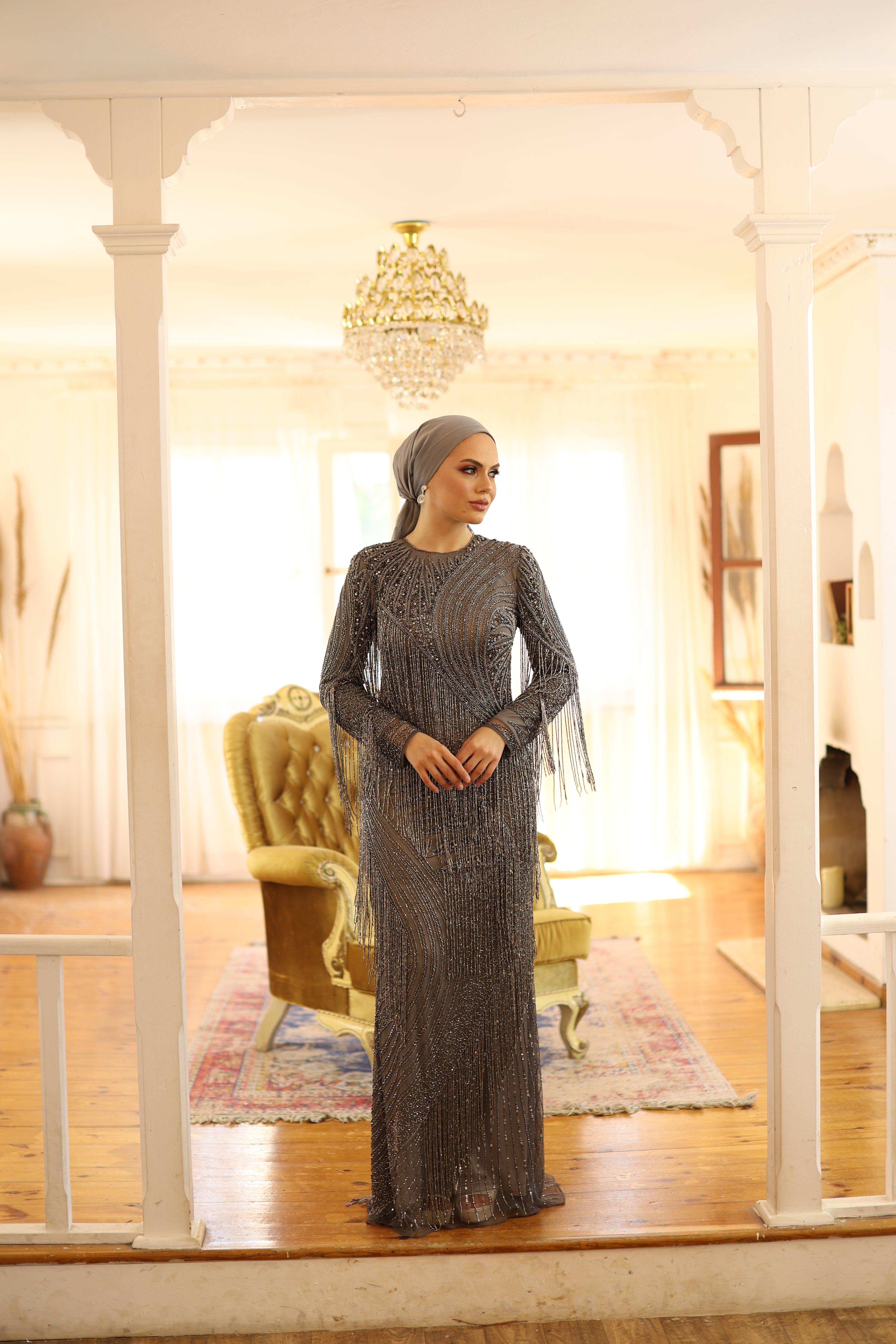Shimmering with elegance, this metallic grey after-party gown captivates with its dazzling beadwork, sequins, and cascading fringe details. Designed with a round neckline and long sleeves, the dress offers a modest silhouette while delivering high-impact glamour. Its bodycon fit highlights the figure beautifully, making it the perfect choice for receptions, engagements, or unforgettable evening celebrations.
