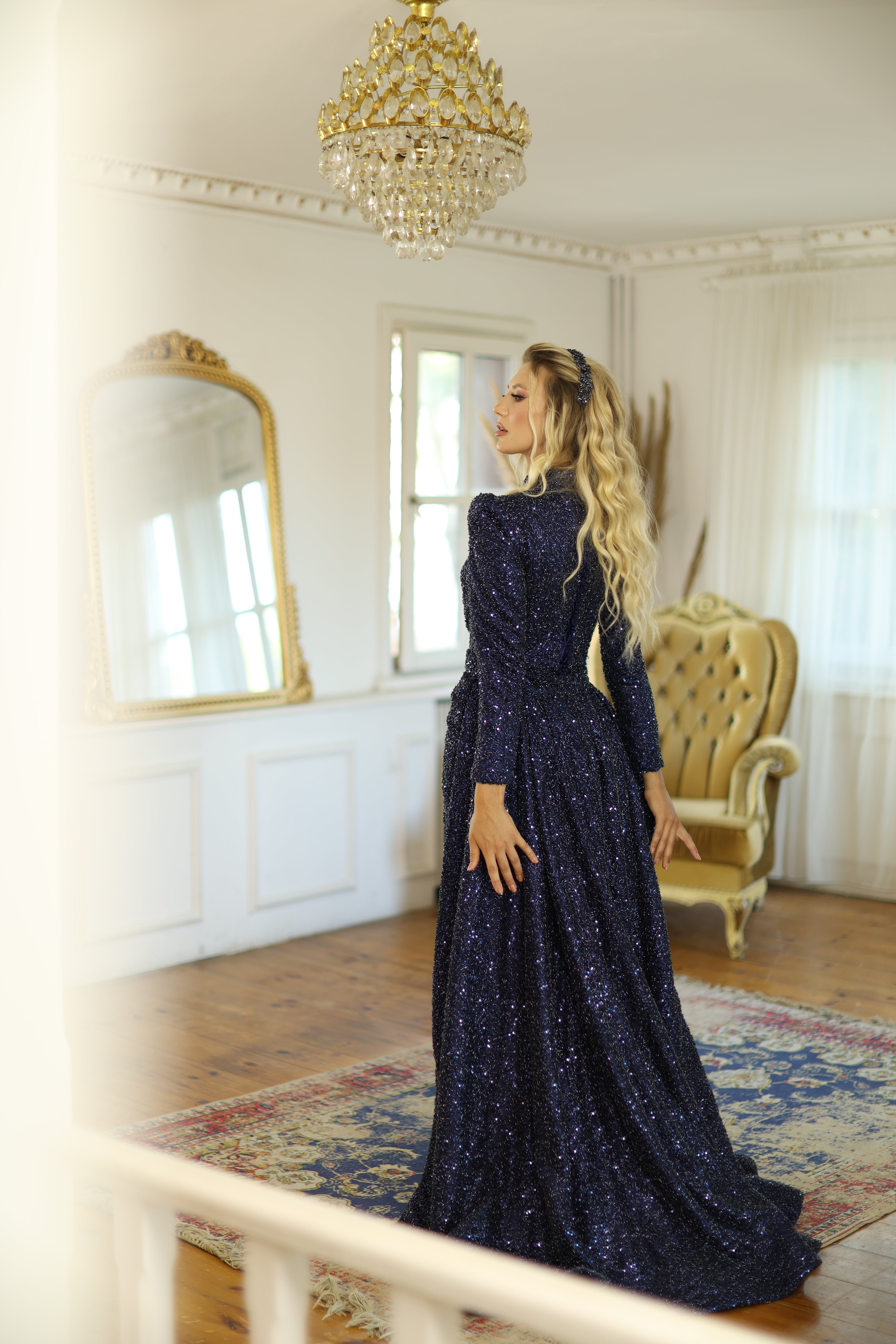 A captivating midnight blue evening gown designed for powerful elegance. Crafted from shimmering glitter fabric, this dress features a high neckline, long sleeves, and a beautifully draped A-line silhouette with a structured peplum detail at the waist. The extended side drape adds drama and sophistication, making this gown a perfect choice for galas, special nights, or engagement events where bold presence meets refined grace.