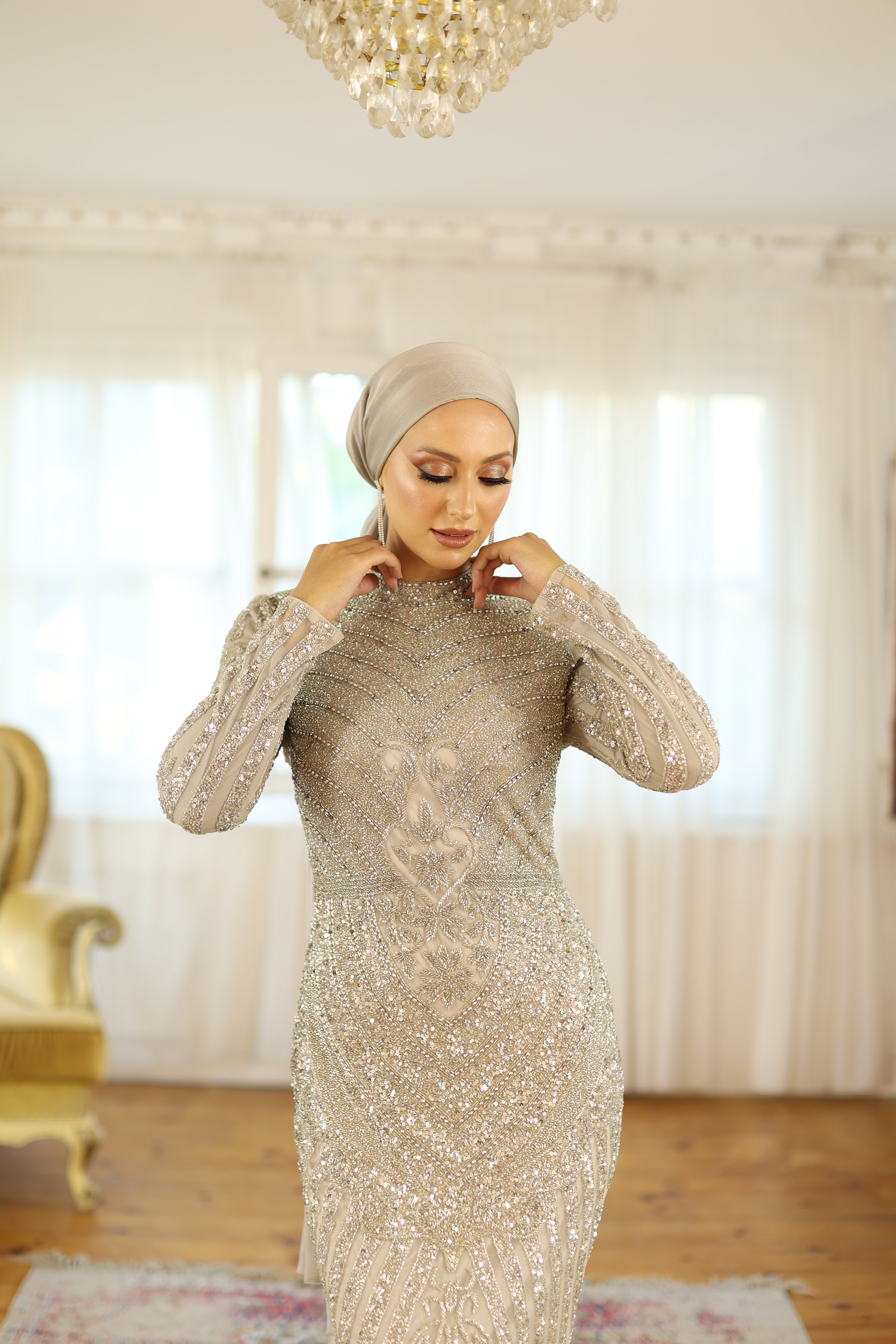 A dazzling evening gown that radiates refined glamour. This body-hugging silhouette features an elegant high neckline and long sleeves, fully adorned with intricate beadwork and shimmering sequins. The luxurious silver tone and modest cut make it an ideal choice for engagement parties, receptions, or sophisticated evening events — designed for women who want to shine with grace and poise.