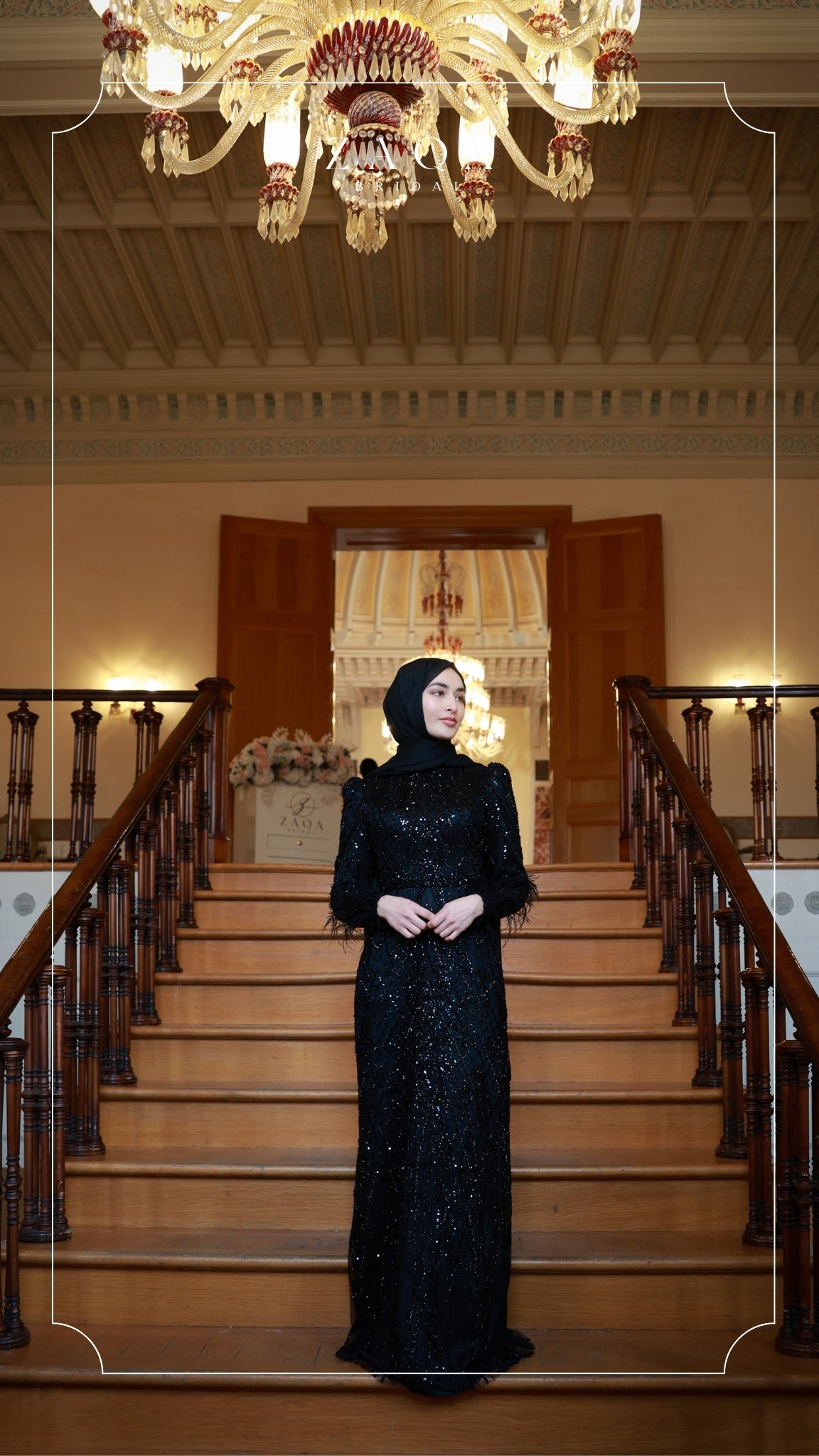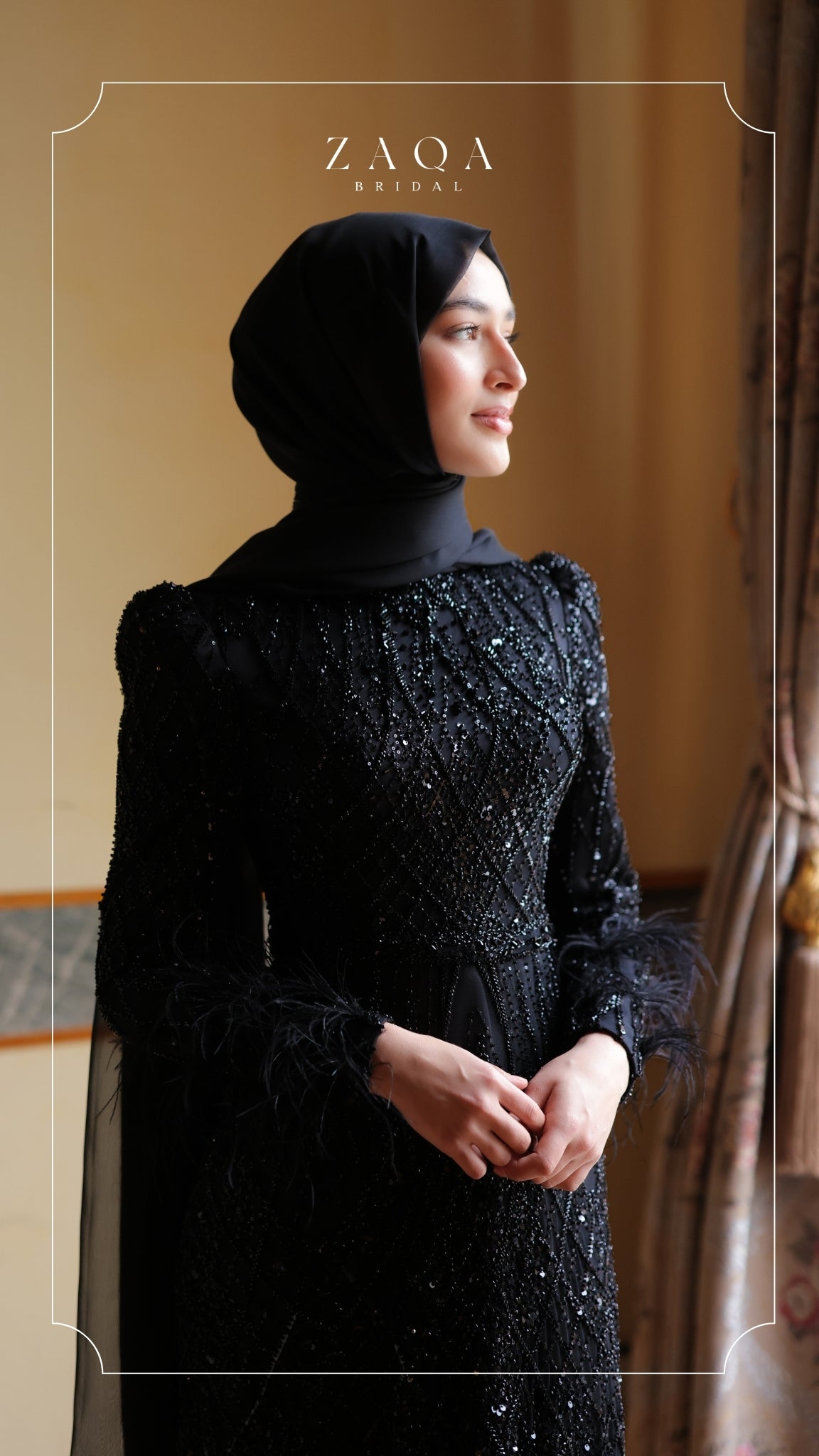 Meet the “Beyza” gown — a sophisticated design crafted in layers of jet-black tulle and beadwork. This full-length, long-sleeve evening gown is adorned with geometric hand-sewn embellishments that create a refined texture across the silhouette. The feather-trimmed cuffs and gently flared hem add drama and grace, while the fitted shape flatters effortlessly. A perfect choice for formal evenings or elegant celebrations.