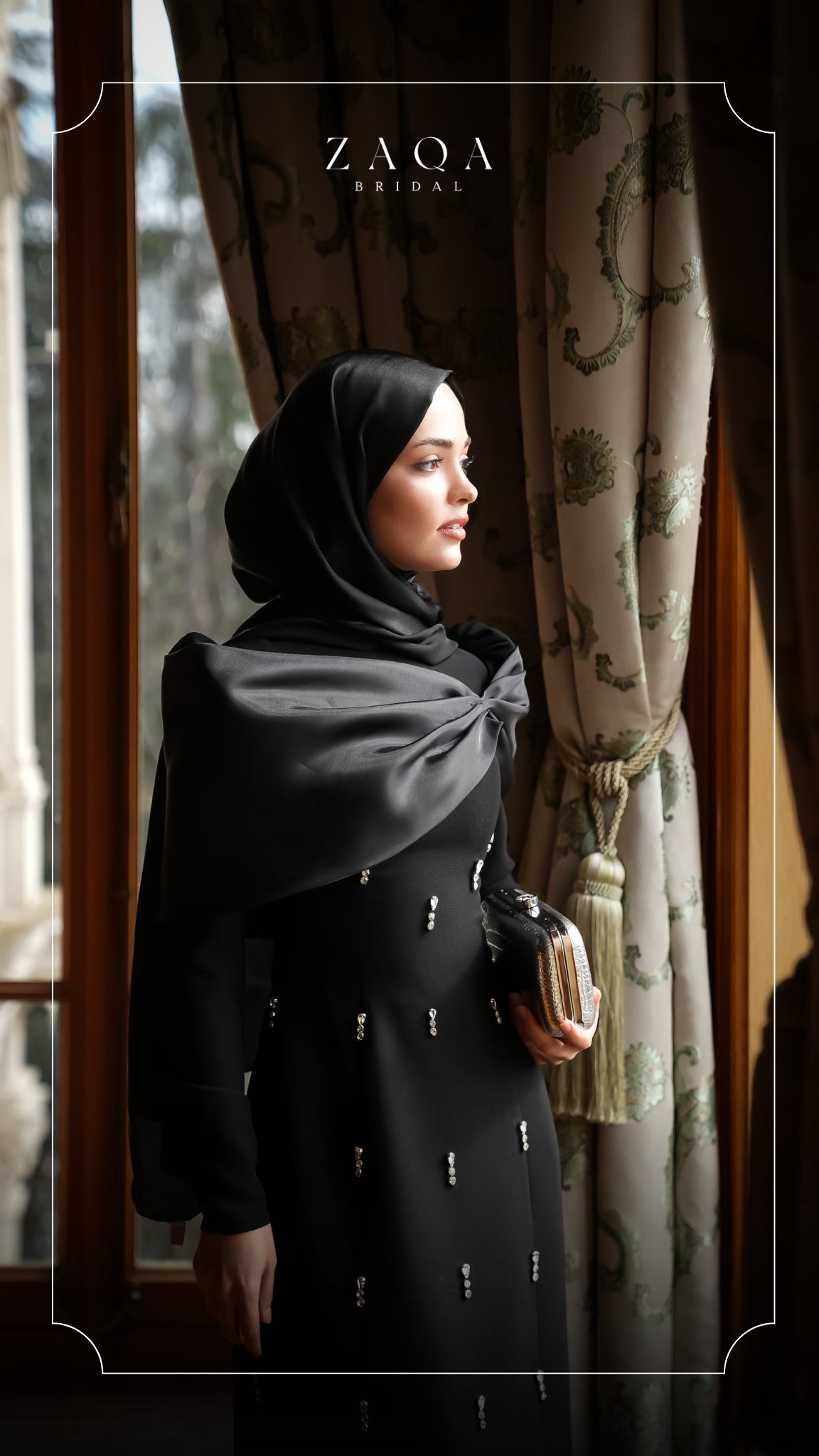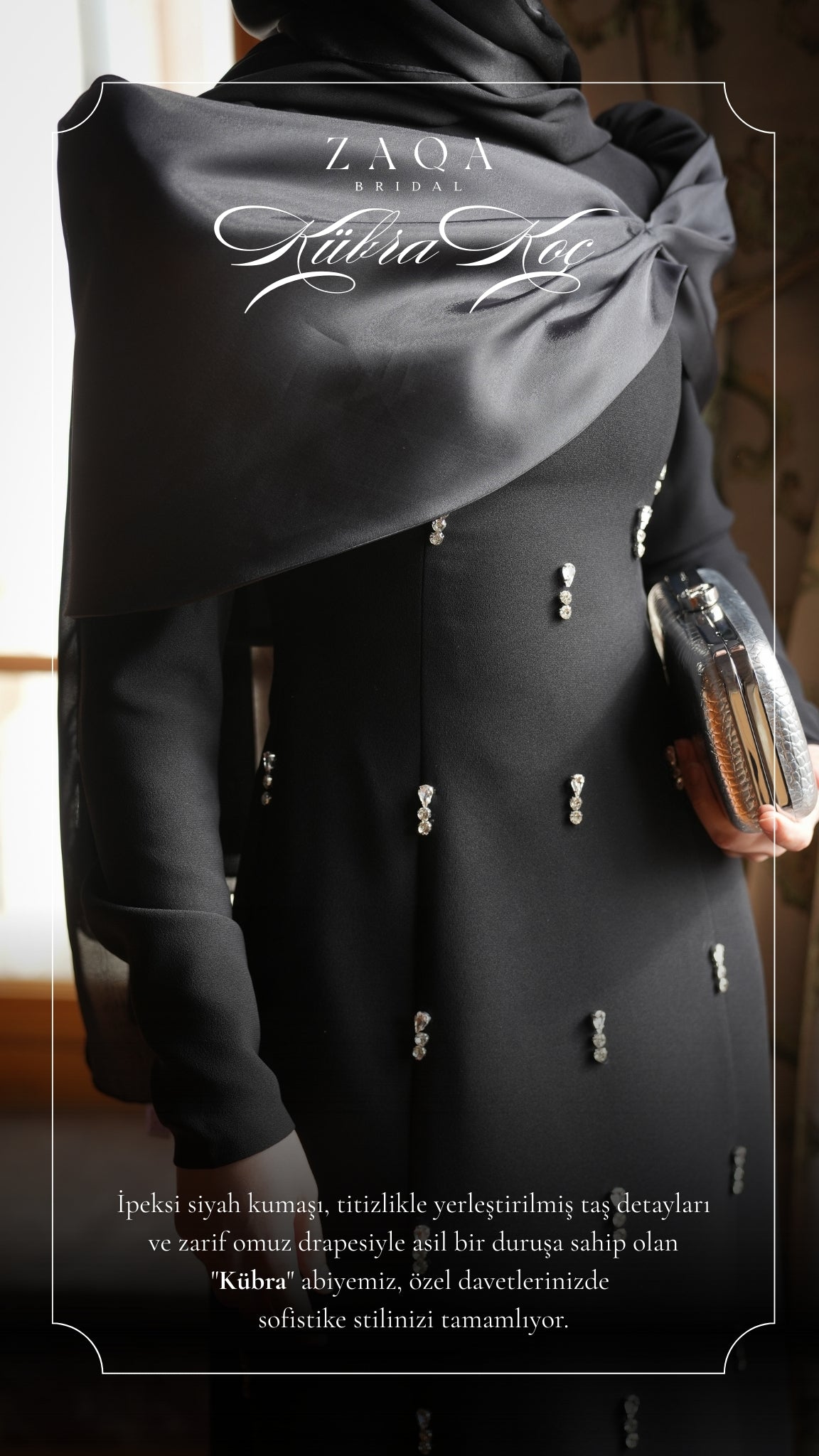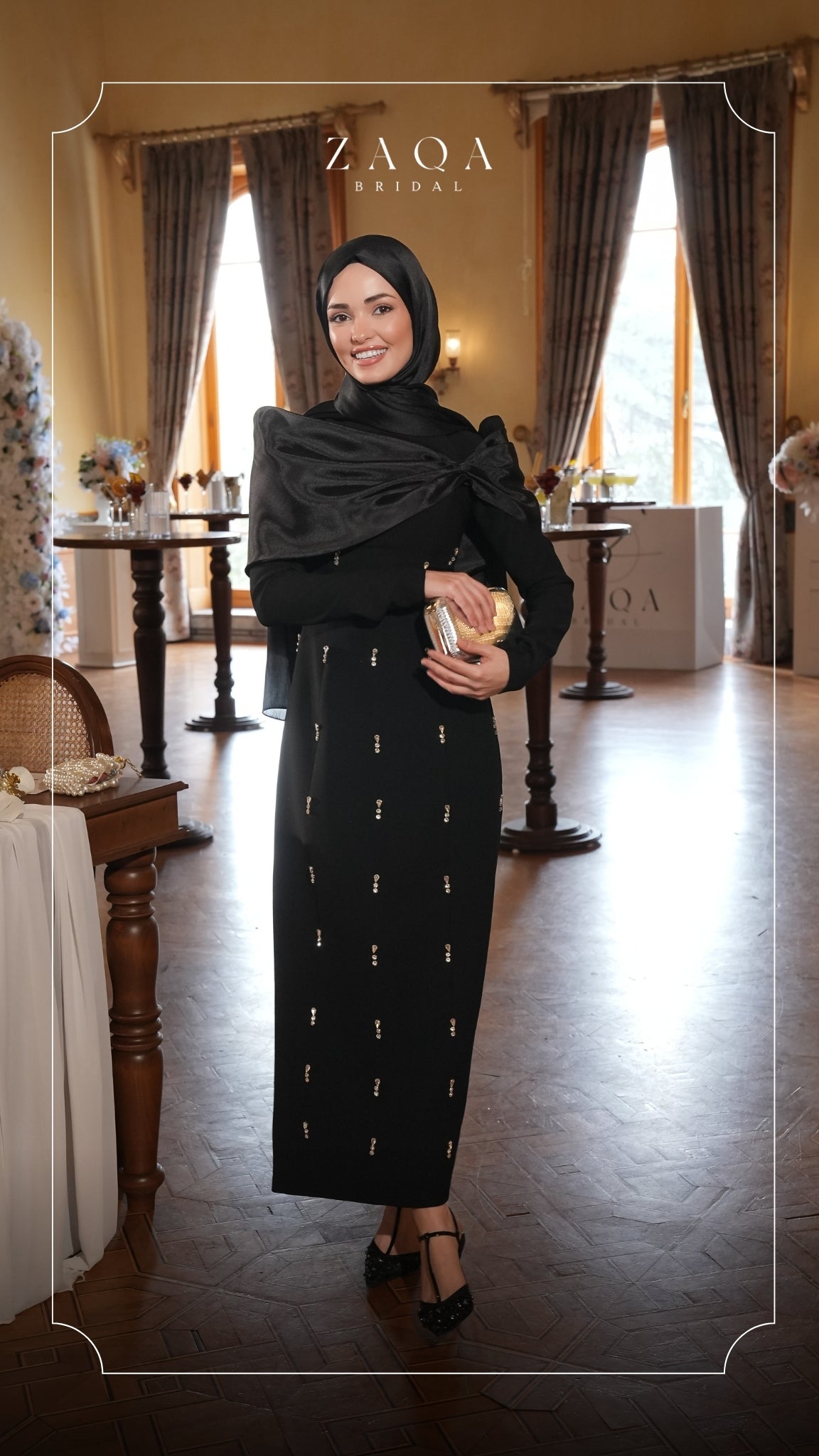 Presenting the “Kübra” gown — a sleek black silhouette that speaks volumes through its simplicity. This straight-cut evening dress features rows of elegant pearl-like embellishments, bringing texture and dimension to its minimalist form. Paired with a soft shawl and a structured clutch, Kübra offers a graceful and confident statement for refined soirées.