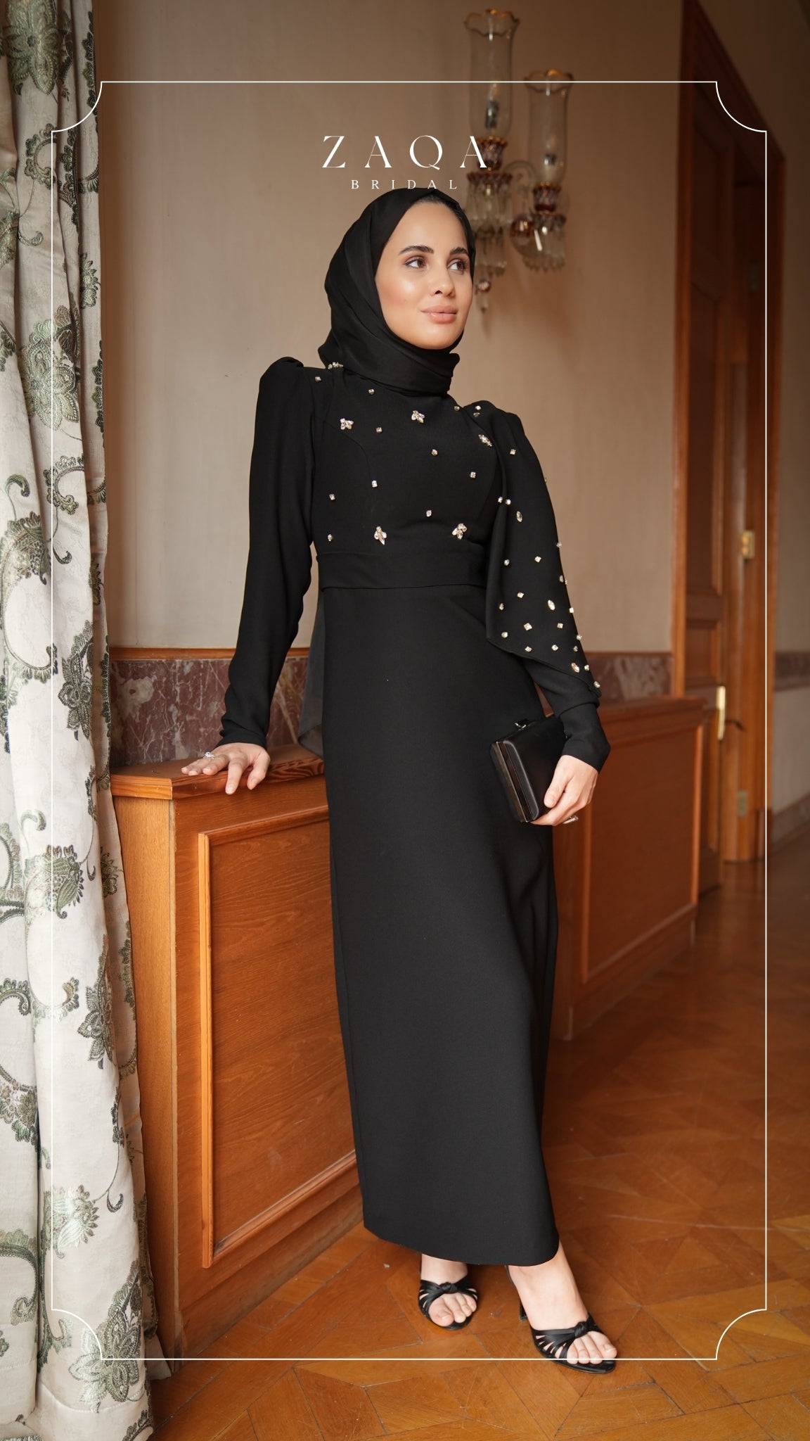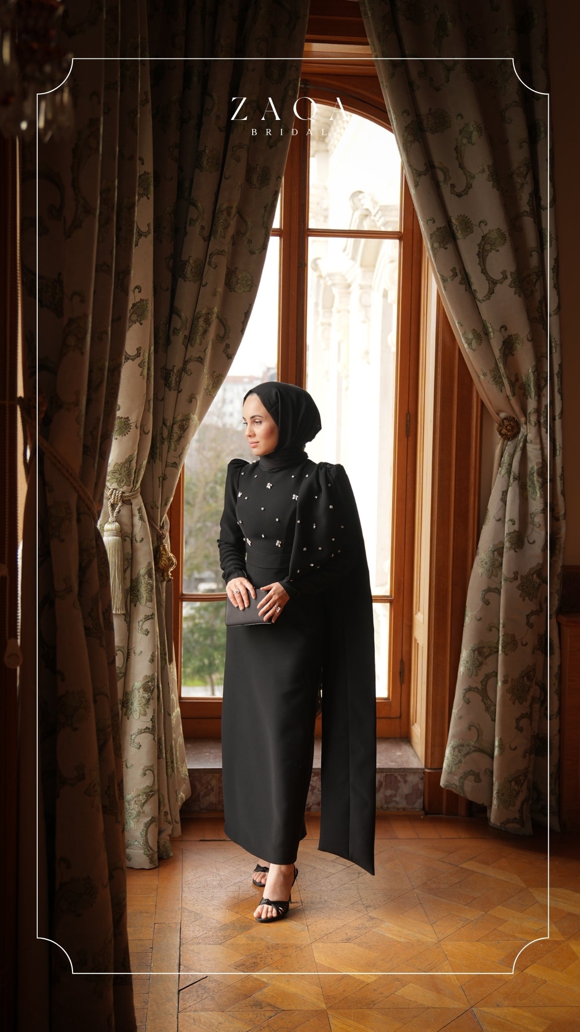 Meet the “Merve” gown — a graceful balance of structure, shine, and strength. Crafted in deep black, this high-neck, long-sleeved design is elevated by delicately scattered gold embellishments. The shoulder cape detail adds movement and a regal edge, ideal for moments that demand presence and poise. Understated yet powerful, “Merve” is a dress made for women who command the room with quiet elegance.