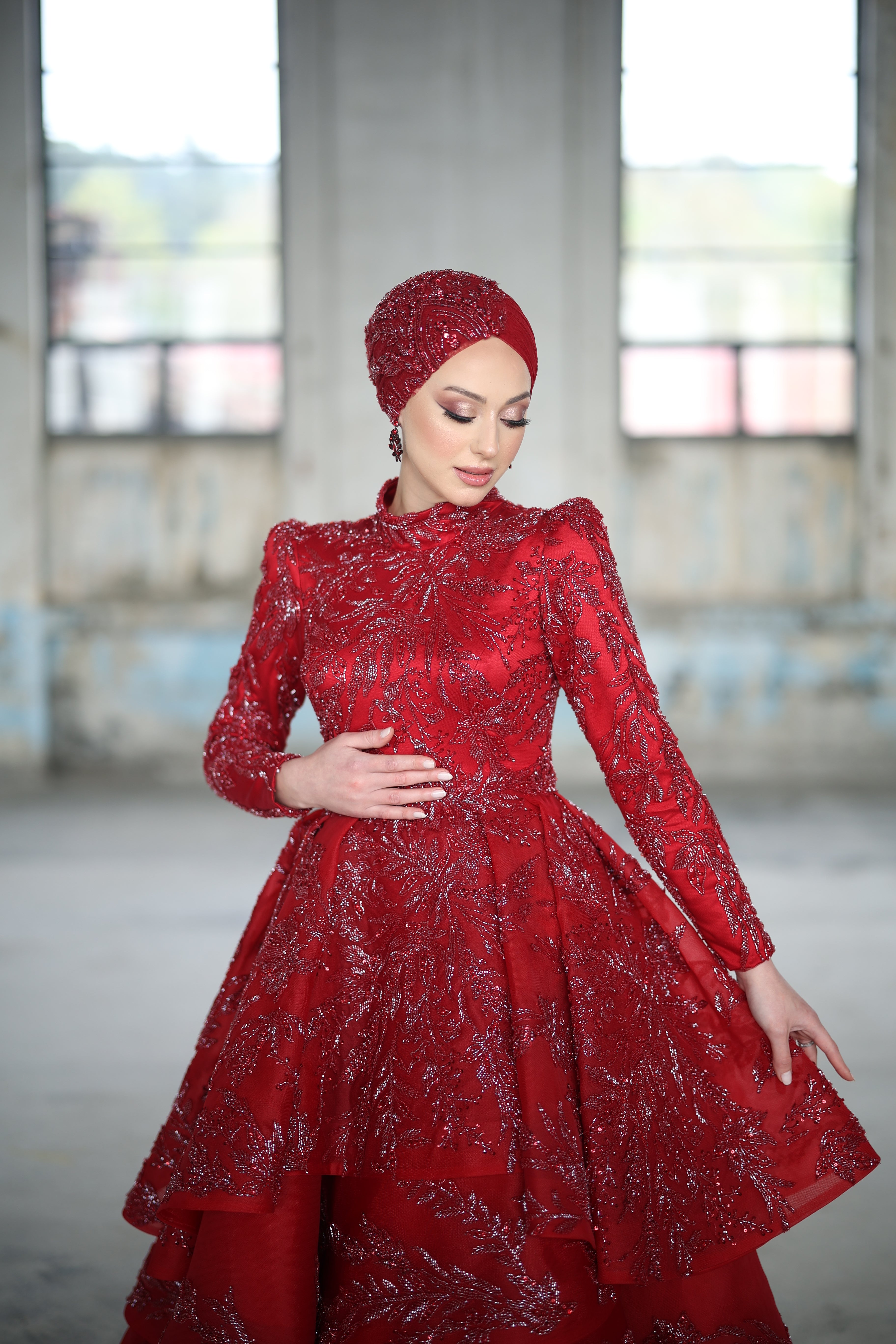 Grand and enchanting, this deep red engagement and evening gown stands out with its luxurious tiered ruffle skirt and intricate silver sequin embroidery. The high neckline and structured long sleeves add elegance to the layered A-line silhouette, while the matching embellished headpiece completes the look. Ideal for engagement nights, henna celebrations, or receptions where majestic presence and modern glamour come together.