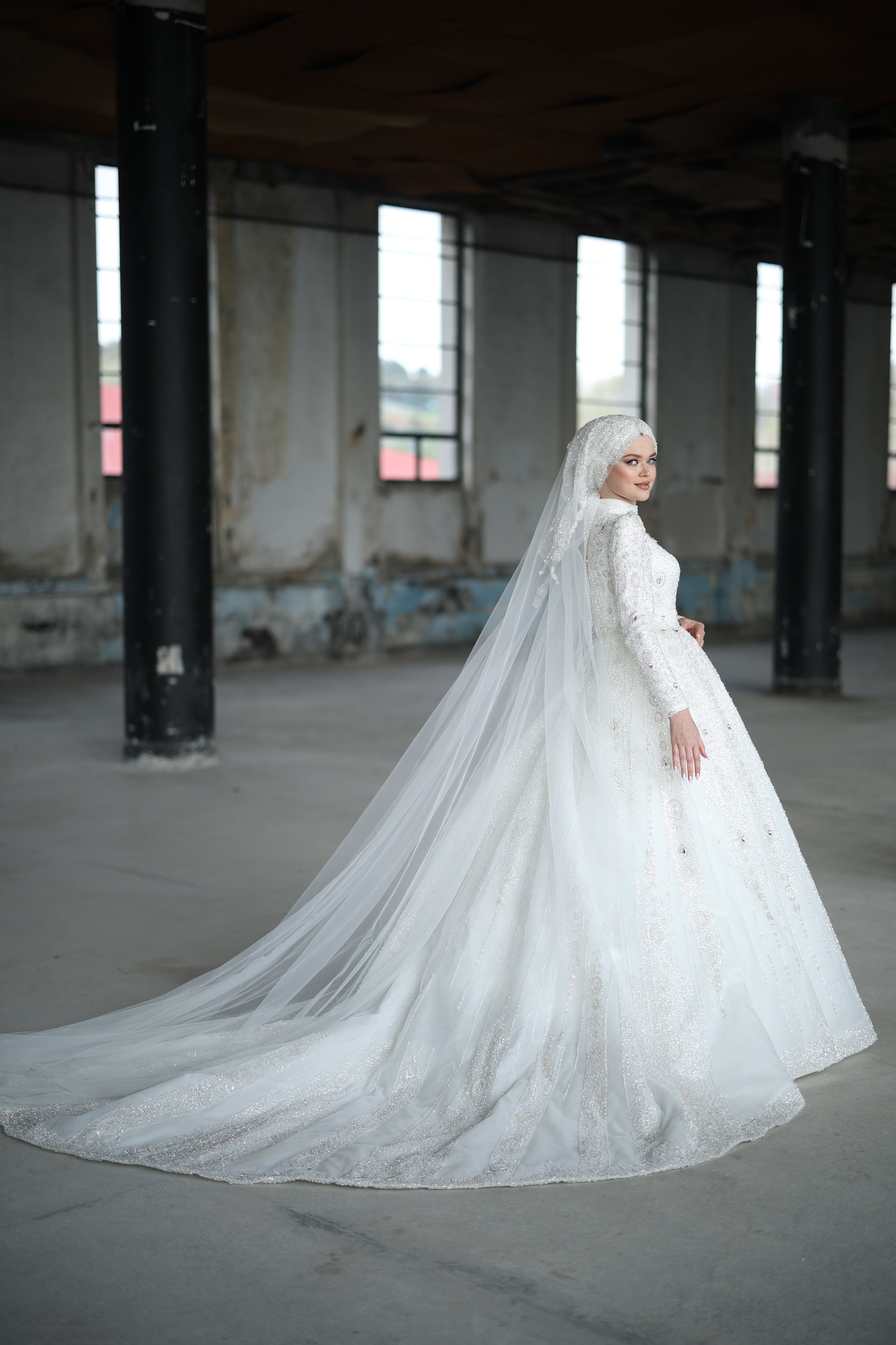 Exuding royal charm and delicate craftsmanship, this soft white bridal gown features exquisite silver sequin and bead embroidery from bodice to hem. The structured puffed shoulders, button-down high neckline, and voluminous skirt with a flowing train create a fairytale silhouette. Paired with a matching fully embellished hijab and veil, this hijab-friendly design is ideal for brides who seek elegance, grace, and tradition on their most special day.