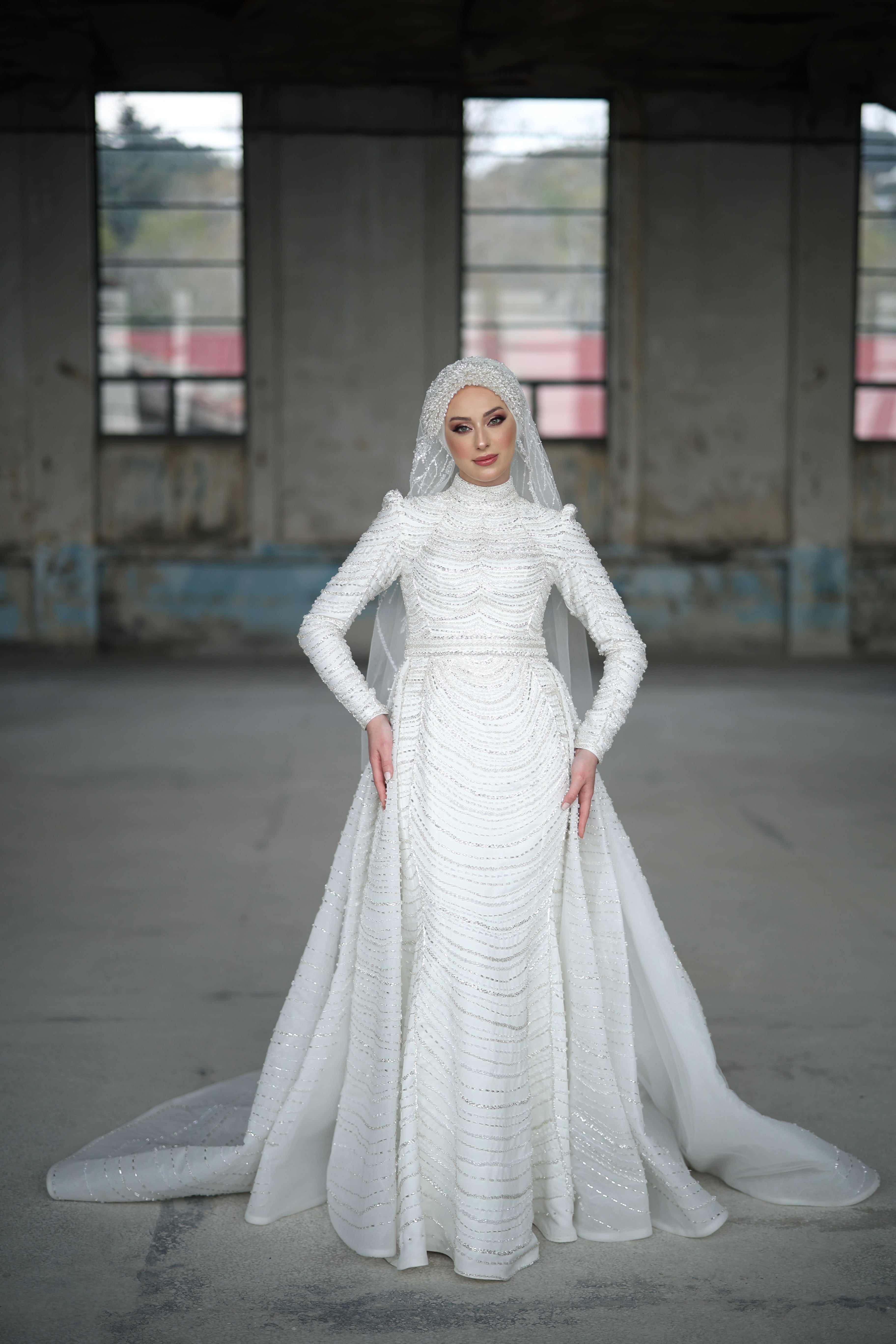 Modern elegance meets timeless grace in this stunning mermaid-cut bridal gown. Crafted in pure white with shimmering silver beadwork arranged in elegant patterns, this design highlights the silhouette beautifully while offering full coverage with its high neckline and long sleeves. The matching beaded hijab and flowing train complete the look, making it the ideal choice for brides seeking sophistication and refinement with a contemporary touch.