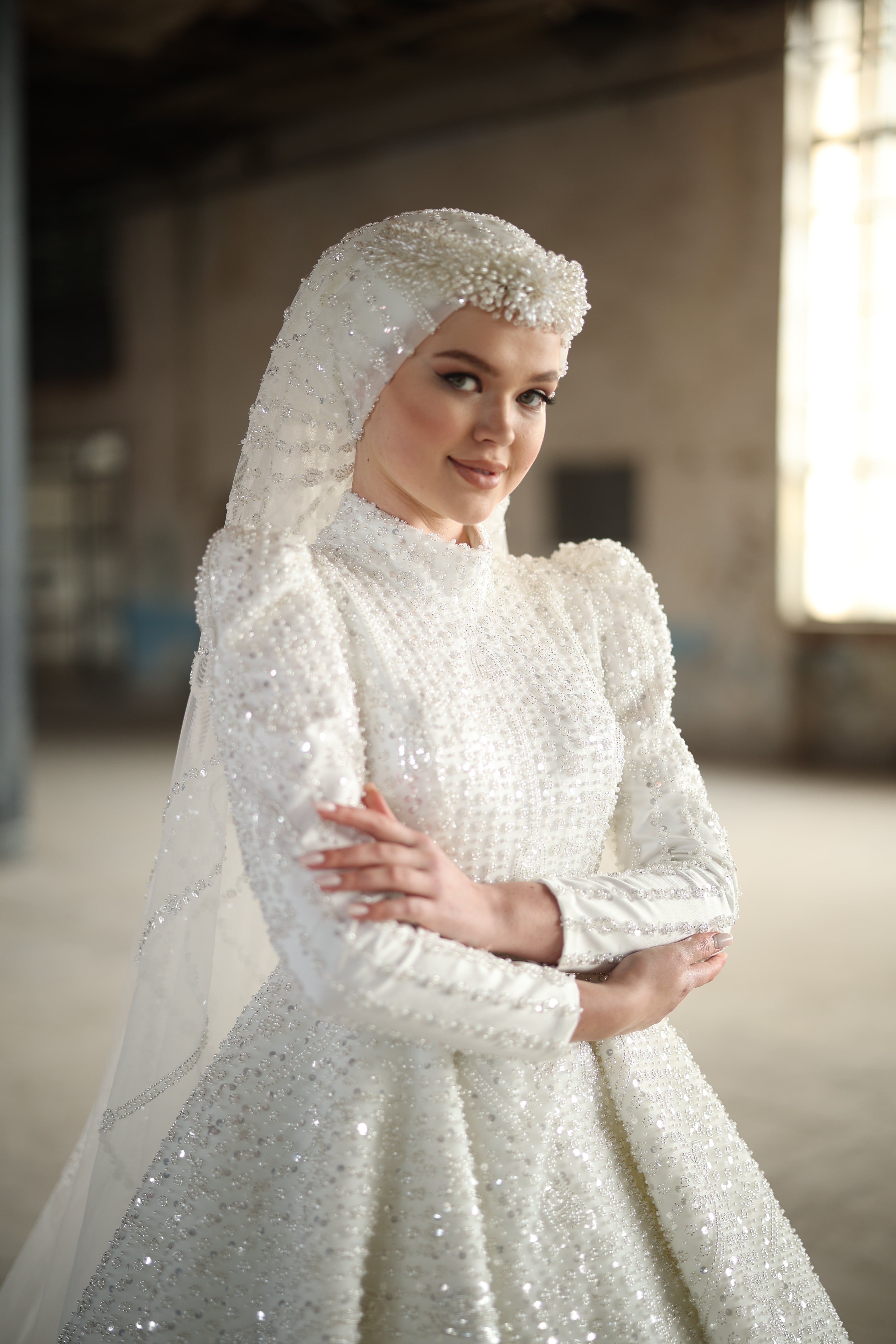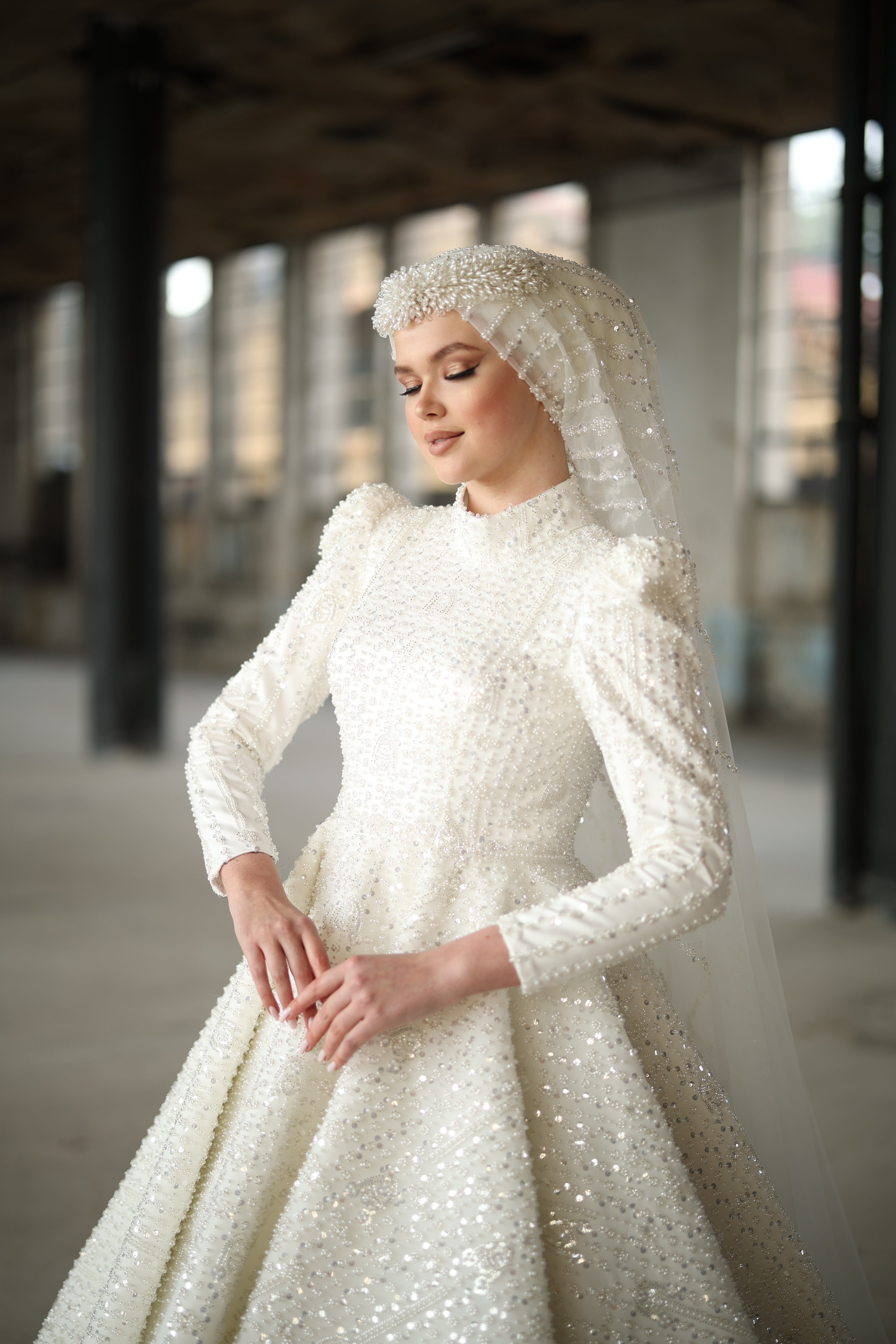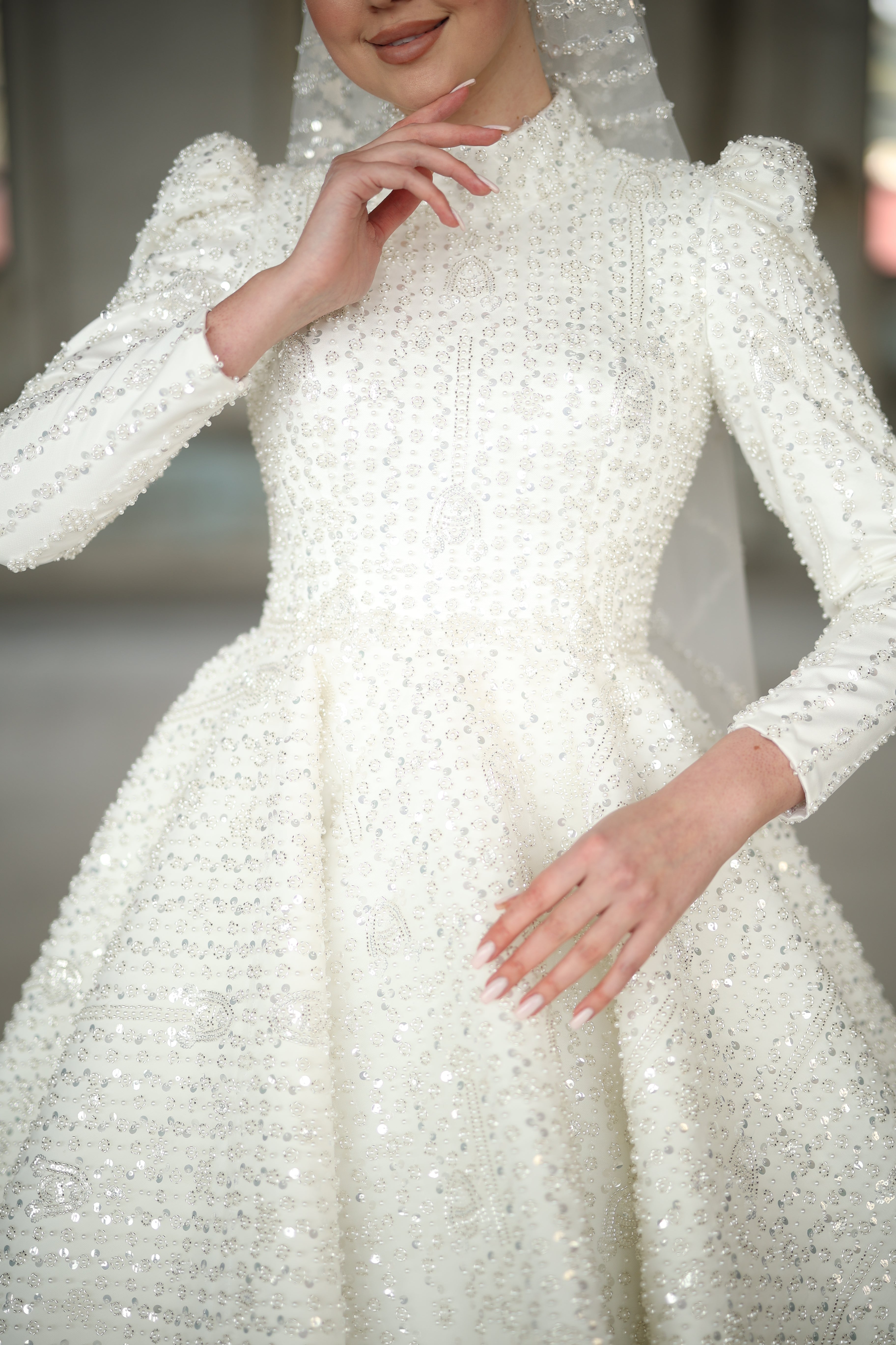 Step into your fairy-tale moment with this pearl white bridal gown, where timeless elegance meets intricate craftsmanship. Designed with a regal high neckline and long sleeves, this dress shines with all-over pearl and bead embellishments, gracefully catching the light with every movement. The voluminous skirt and the pearl-detailed hijab complete the look for the bride who dreams of radiance, grace, and royal sophistication.